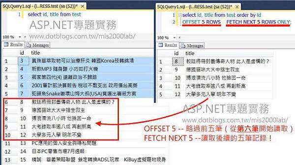 使用SQL 2012起可用的 OFFSET-FETCH,搭配ADO.NET (DataReader)來做分頁(Paging)。