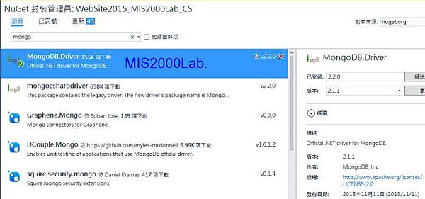 您可以先在Visual Studio的「NuGet」裡面搜尋「MongoDB」關鍵字並且安裝相關套件 -- MongoDB.Driver。