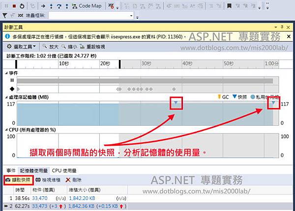 您要觀察記憶體使用量,請看圖片左下方的「擷取快照」,就能在兩個時間點之間,進行觀察。