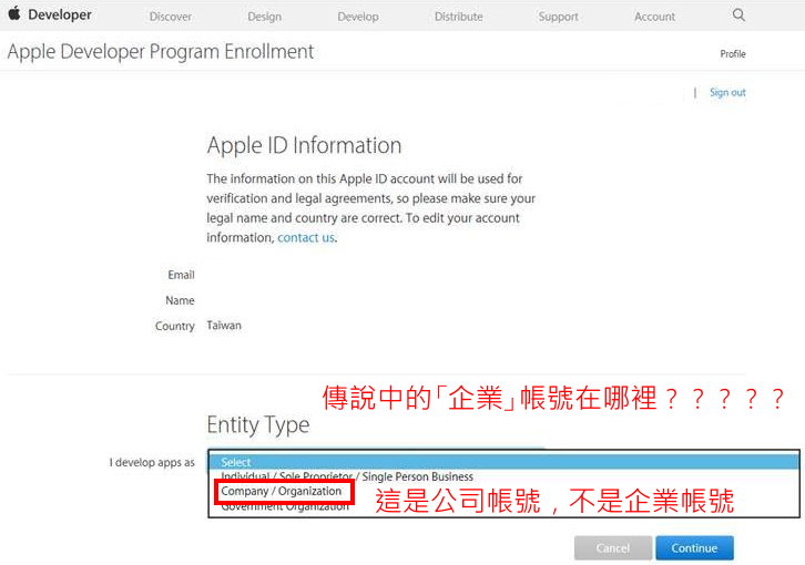 傳說中,還有一個選項,名為:企業。(這一種很特別,您的APP不能放到商店裡面,只允許企業內部使用。)