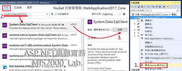 第一,加入 System.Data.SqlClient 命名空間。您必須透過 NuGet來加入 這裡有異動!